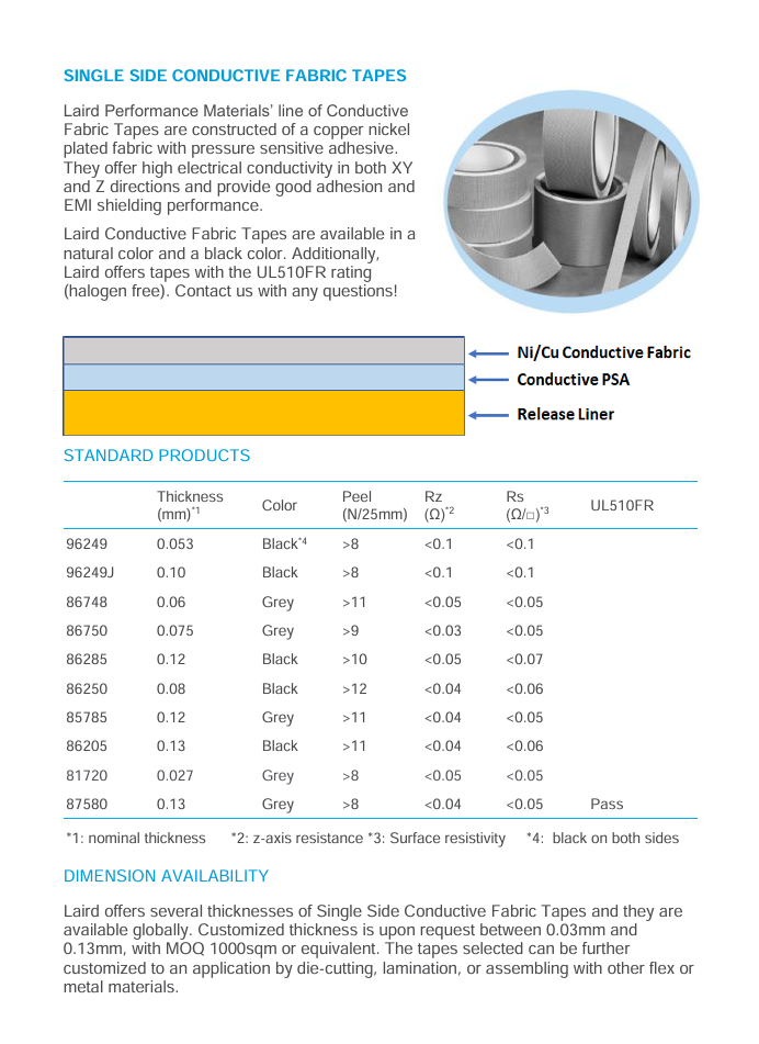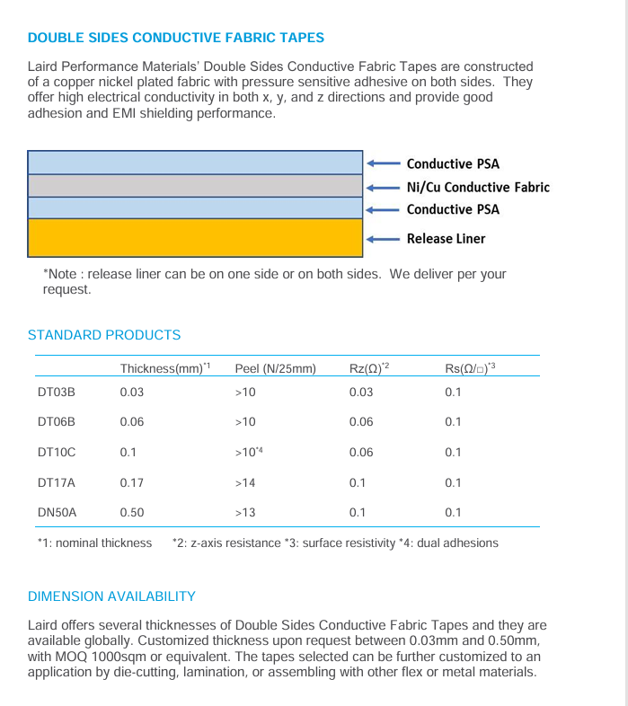 莱尔德 Double-Sided Conductive Fabric Tapes 是一种高性能、柔性极佳的电磁干扰(EMI)屏蔽与接地解决方案。该产品以独特的导电布为基材,双面涂覆莱尔德专有的导电压敏胶(PSA),形成一种“三明治”结构的各向异性导电材料。