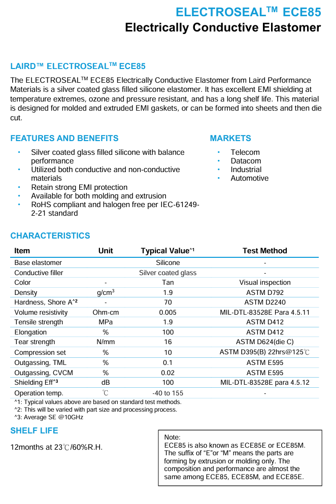 ECE085具有优异的屏蔽性能和导电性。该材料在极端温度下密封,具备臭氧抗性,且保质期长。推荐用于对屏蔽要求要求高的应用,包括电磁脉冲。ECE085为MIL-G-83528 M型认证材料。