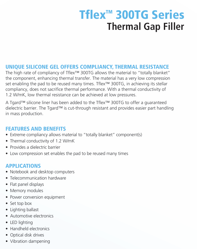 Tflex 300TG增加了Gard硅胶内衬,以保证介电屏障。Tgard 具有防切割性,且在大规模生产中提供更便捷的零件搬运