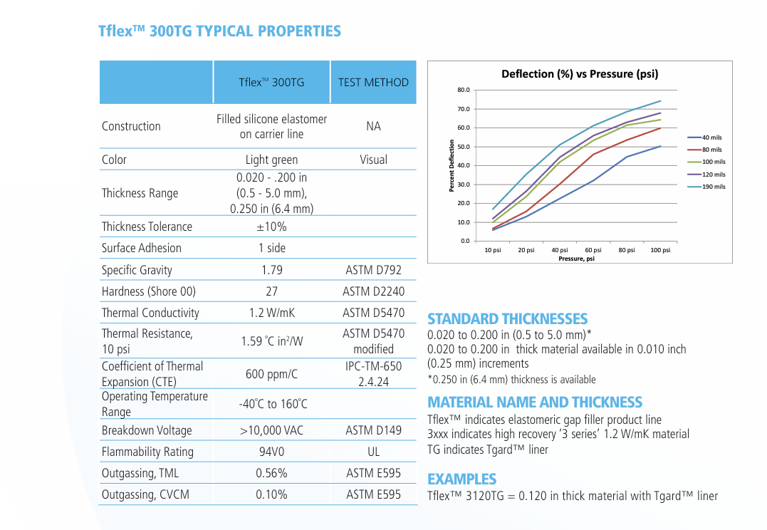 Tflex 300TG的高顺服率使材料能够完全覆盖组件,增强热传递。该材料具有非常低的压缩强度,使得刹车垫可以多次重复使用。Tflex 300TG在实现卓越兼容性的同时,并未牺牲热性能。热导率为1.2 W/mK,可在低压下实现低热阻。