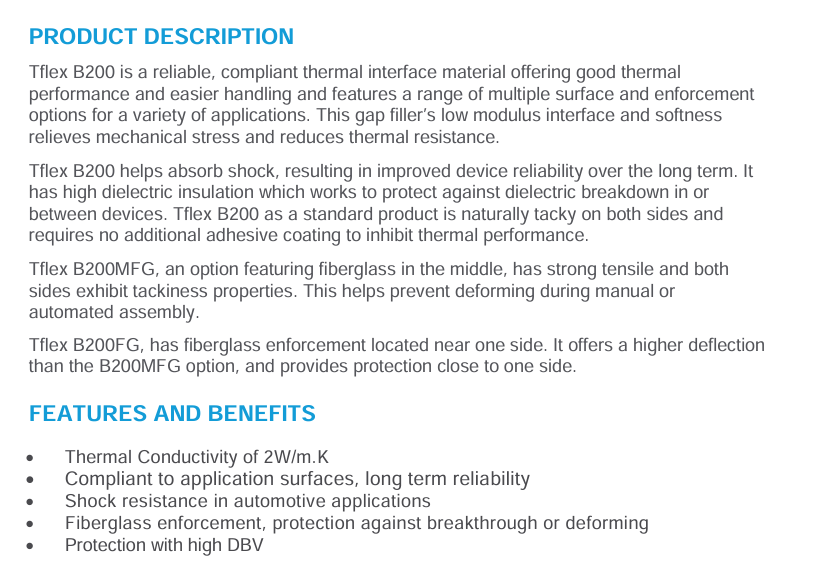 Tflex B200是一种可靠、合规的热界面材料,具有良好的热性能和易于作的特性,并具备多种多表面和加固选项,适用于多种应用。这种间隙填充剂的低模量和低软度减轻了机械应力。