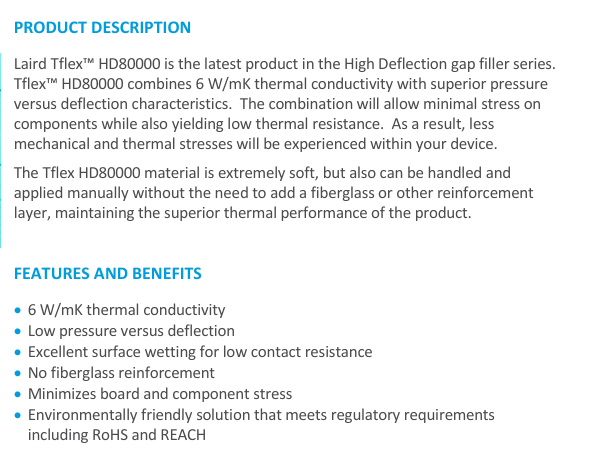 Tflex HD80000材料极其柔软,但也可手动作和施工,无需添加玻璃纤维或其他加固层,从而保持产品的优越热性能。