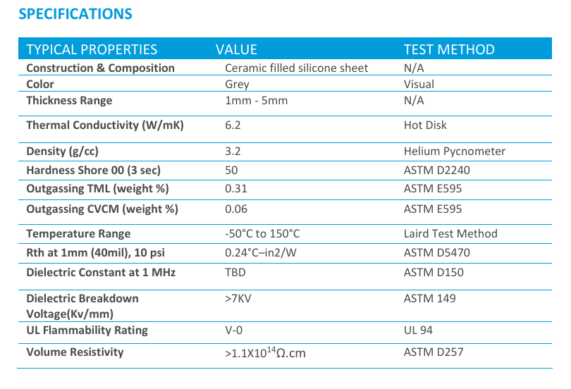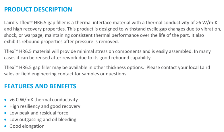 该产品采用先进的陶瓷填充硅胶技术,呈现出独特的灰色。Tflex™ HR6.5 的核心特性在于其 “高回弹性” ,它不仅具备优异的导热性能,更拥有卓越的力学结构。其导热系数达到 6.5 W/mK,能够在保持低热阻的同时,应对反复的压缩与释放循环。这款材料设计用于在长期使用中维持稳定的接触压力,确保热传导路径始终高效畅通。