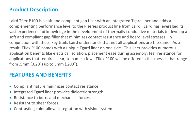 Laird Tflex P100 是一种柔软、顺应性的间隙填充材料,内置了 Tgard 内衬,为 Laird 的 P 系列产品线增添了相应的性能水平。Laird凭借其在热导材料开发方面的丰富经验和知识,开发出一种柔软且顺应性的间隙填充剂,最大限度地减少接触阻力和板面应力。结合这些关键特征,Laird明白并非所有应用都相同。因此,Tflex P100 一侧配有独特的 Tgard 内衬。这种衬垫在应用上具有多种优势,如电气隔离、组装时的安装便利性以及需要剪切的应用具有抗撕裂性等特性。