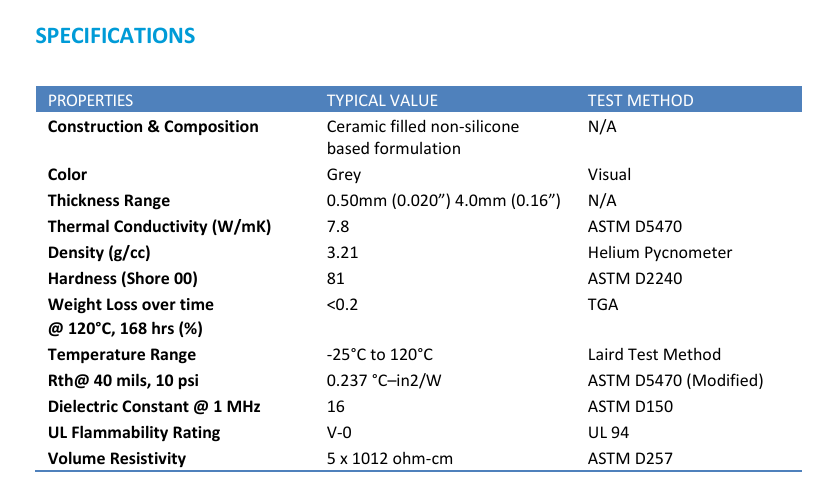 该产品采用先进的陶瓷填料与热塑性弹性体复合技术。与传统的硅胶基导热垫片不同,Tflex™ SF800 彻底摒弃了硅酮成分,消除了挥发性物质(Silicone Outgassing)的风险。其核心参数极为亮眼,导热系数高达 7.8 W/mK,同时具备极低的热阻和优异的表面润湿性。材料质地柔软,能够在较低的压力下实现良好的压缩形变,确保热量在发热源与散热器之间快速传导。
