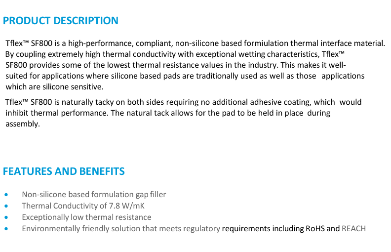 效果:凭借 7.8 W/mK 的超高导热系数,Tflex™ SF800 能够迅速将热量从热点传导至散热器,显著降低芯片结温。相比普通的无硅导热材料,它在高功率应用场景下表现更为出色,确保设备在长时间高负荷运行中依然保持冷静与稳定。