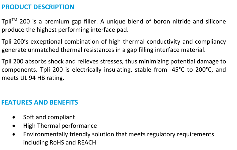 Tpli 200 是一种极其柔软、高度可压缩的优质间隙填充剂。Tpli 200 以高热导率和顺应性为卓越组合,在间隙填充界面材料中产生了无与伦比的热阻。Tpli 200 吸收冲击并减轻应力,从而最大限度地减少元件的潜在损伤。Tpli 200 具有电绝缘性,稳定温度范围为 -45°C 至 200°C,并符合 UL 94 HB 认证