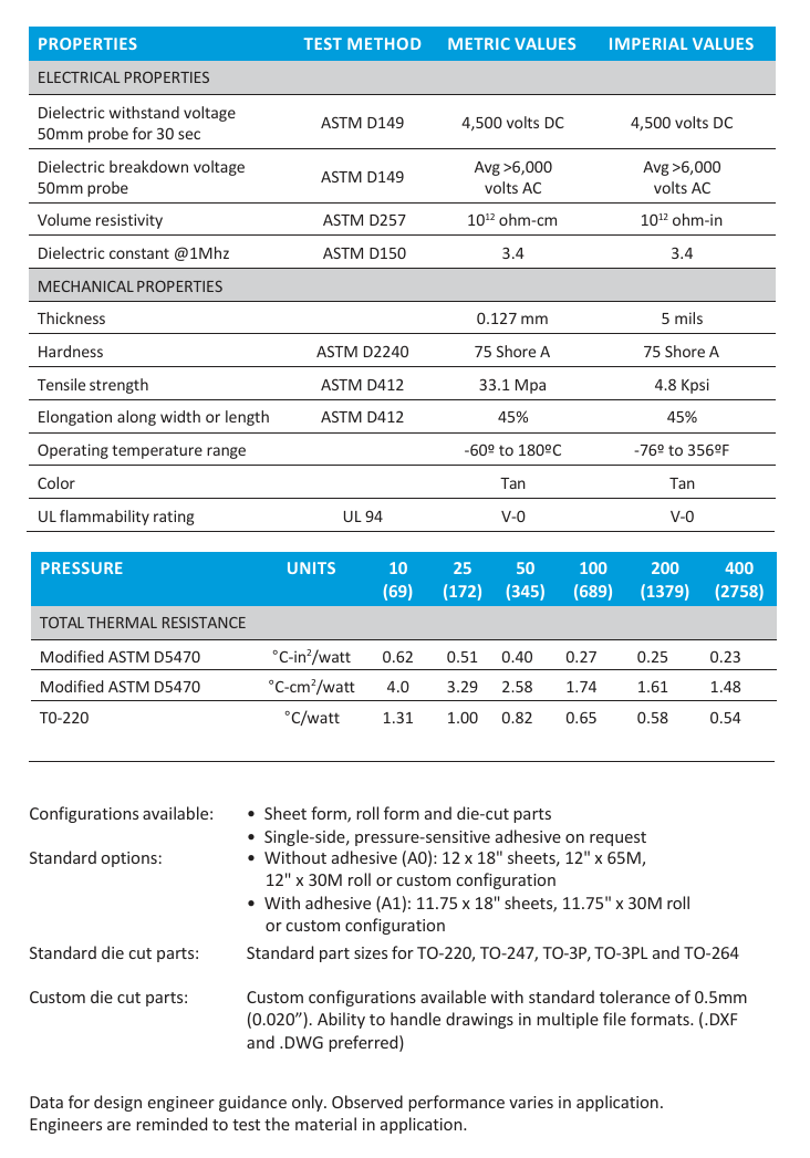 Tgard™ 5000 其独特的材料结构由聚酰亚胺薄膜(Polyimide Film)作为基材,单面或双面涂覆陶瓷填充的高温硅橡胶组成。这种复合结构赋予了它极佳的机械强度与热传导性能。其核心设计理念在于 “坚韧防护” 与 “高效绝缘” :它不仅拥有出色的导热系数(约 1.3 W/m·K),更具备极高的介电强度(>6000V AC)。与传统的玻璃纤维绝缘材料相比,Tgard™ 5000 更薄、更柔软,且具有优异的抗切割性能,能够有效防止在装配过程中因散热器边缘锐利而导致的材料破损和短路风险。