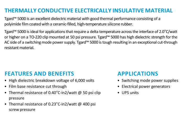 Tgard 5000 是一种卓越的介电材料,具有良好的热性能,由涂覆陶瓷填充高温硅橡胶的聚酰亚胺薄膜组成。Tgard 5000 非常适合需要在 TO-220 夹具上达到 2.0ºC/瓦特或更高、压力为 @ 50 psi 的应用。Tgard 5000 在开关电源交流端具有高介电强度。Tgard 5000 非常坚固,因此是一种极佳的耐穿透材料。