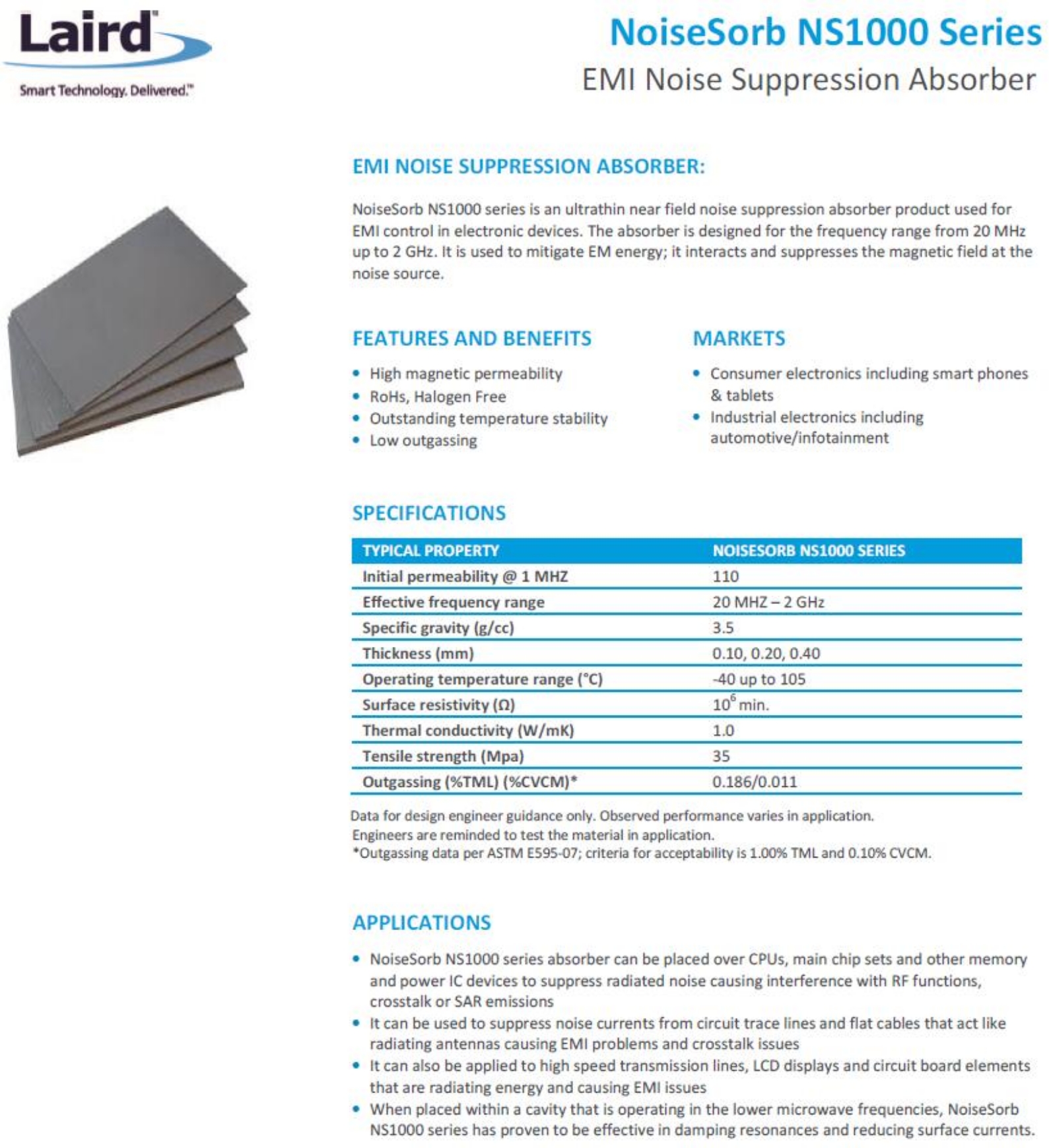 NS1000系列是一种超薄近场噪声抑制吸收器产品,用于电子设备中的电磁干扰控制。吸收器的设计频率范围为20兆赫高达2 GHz。